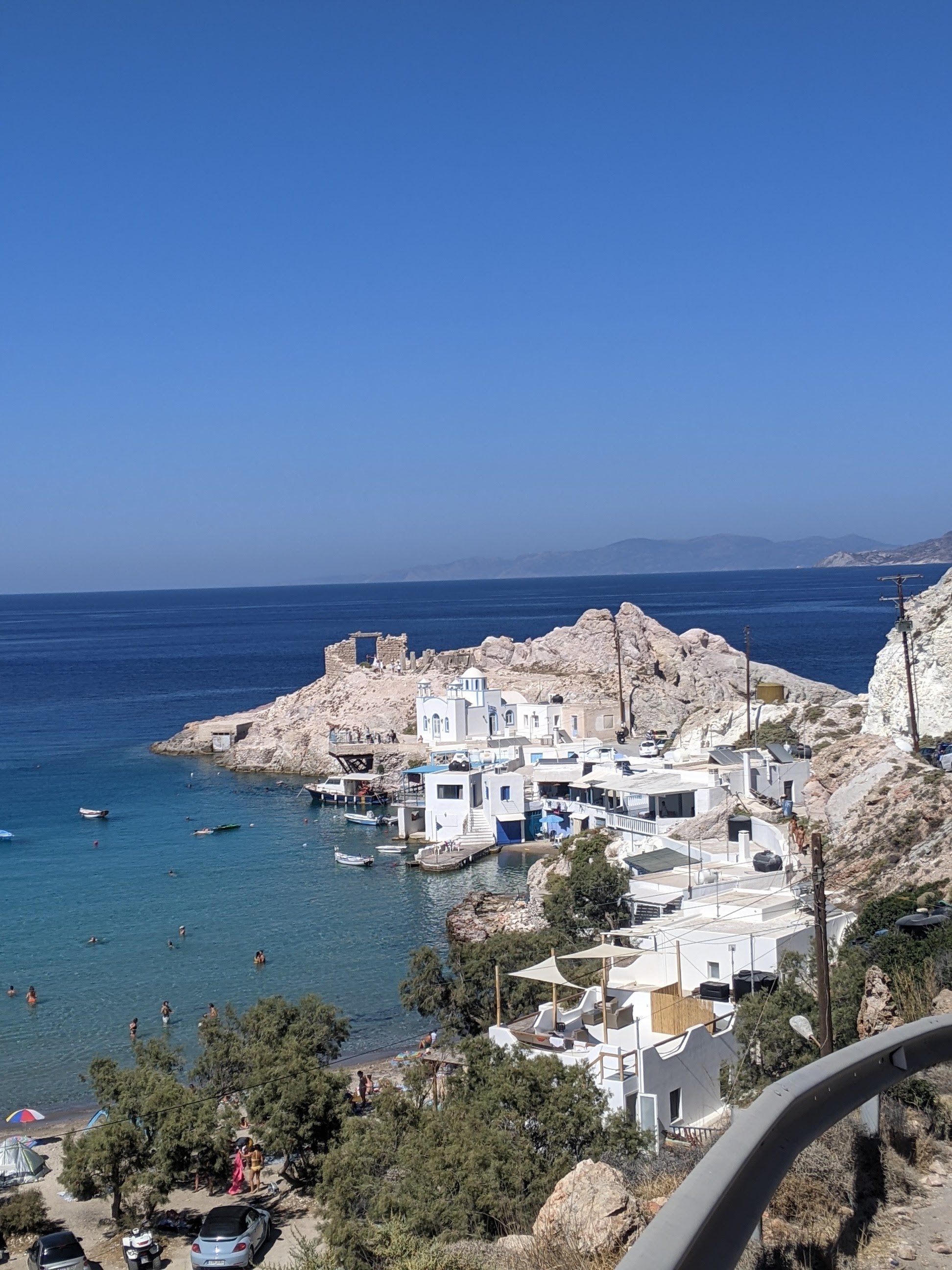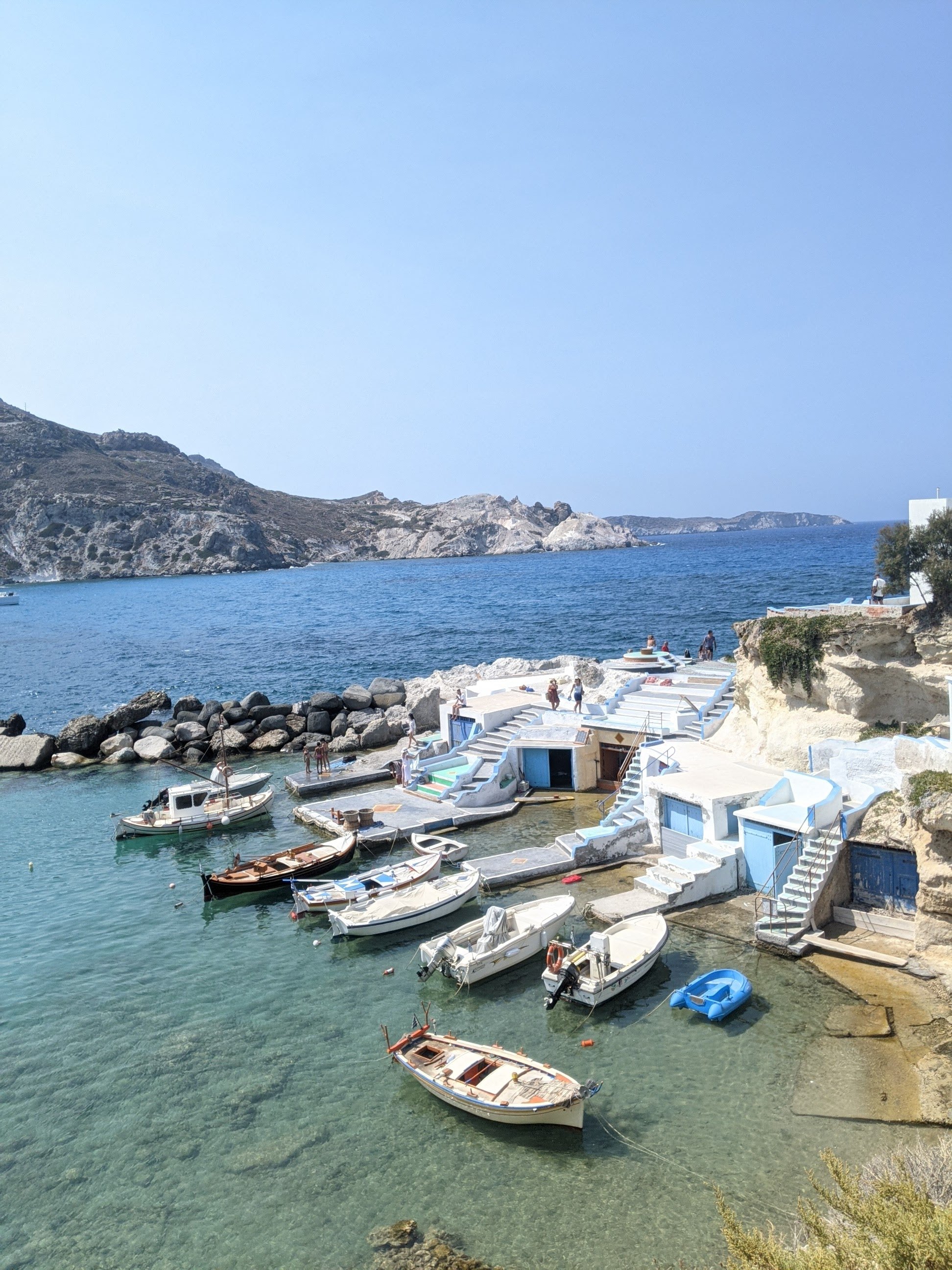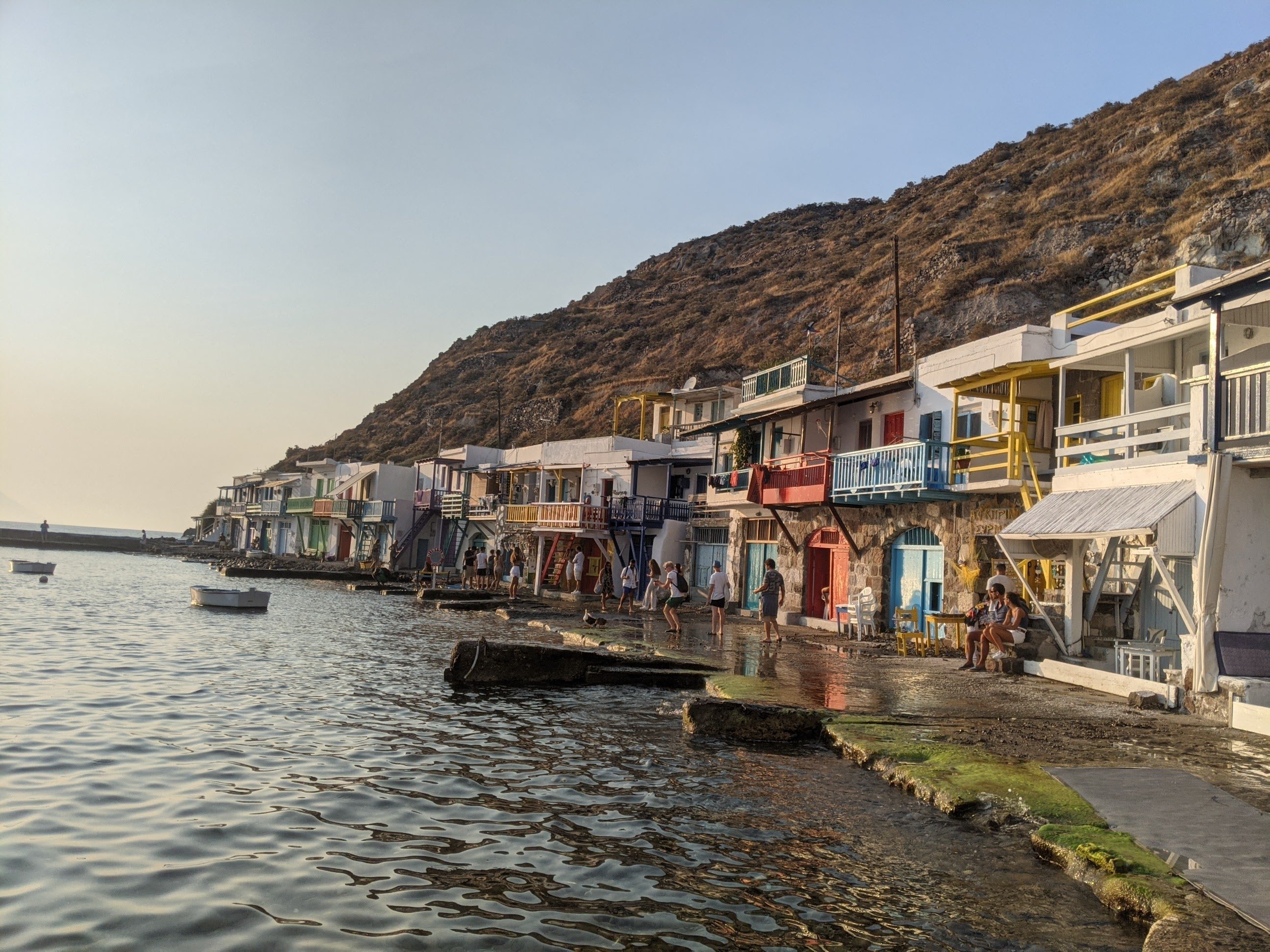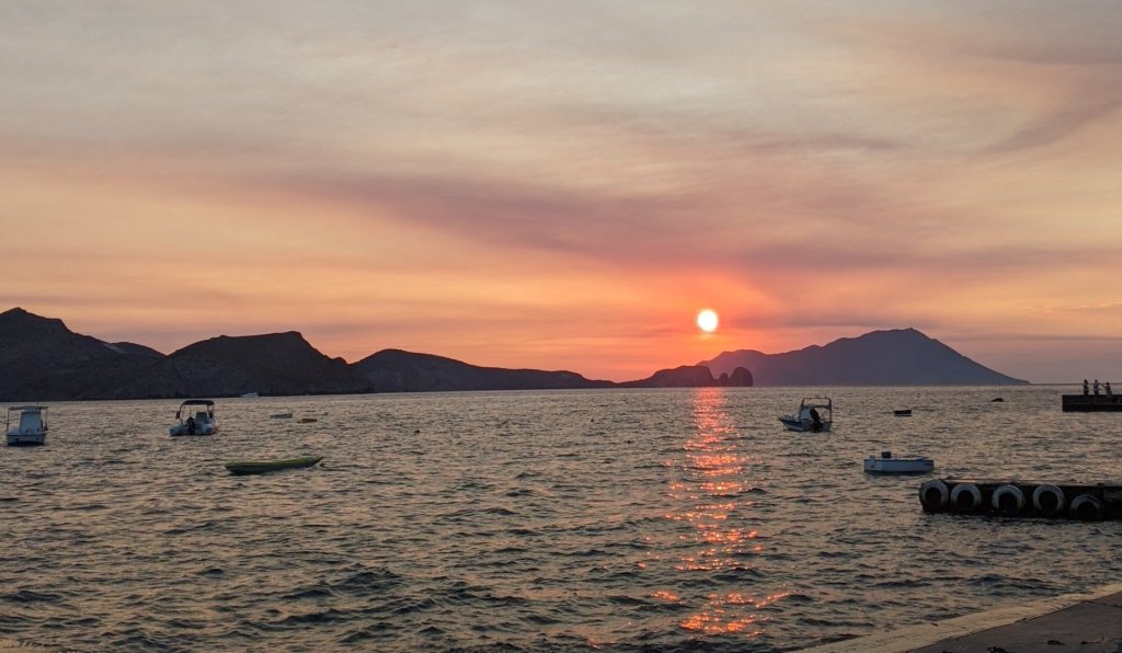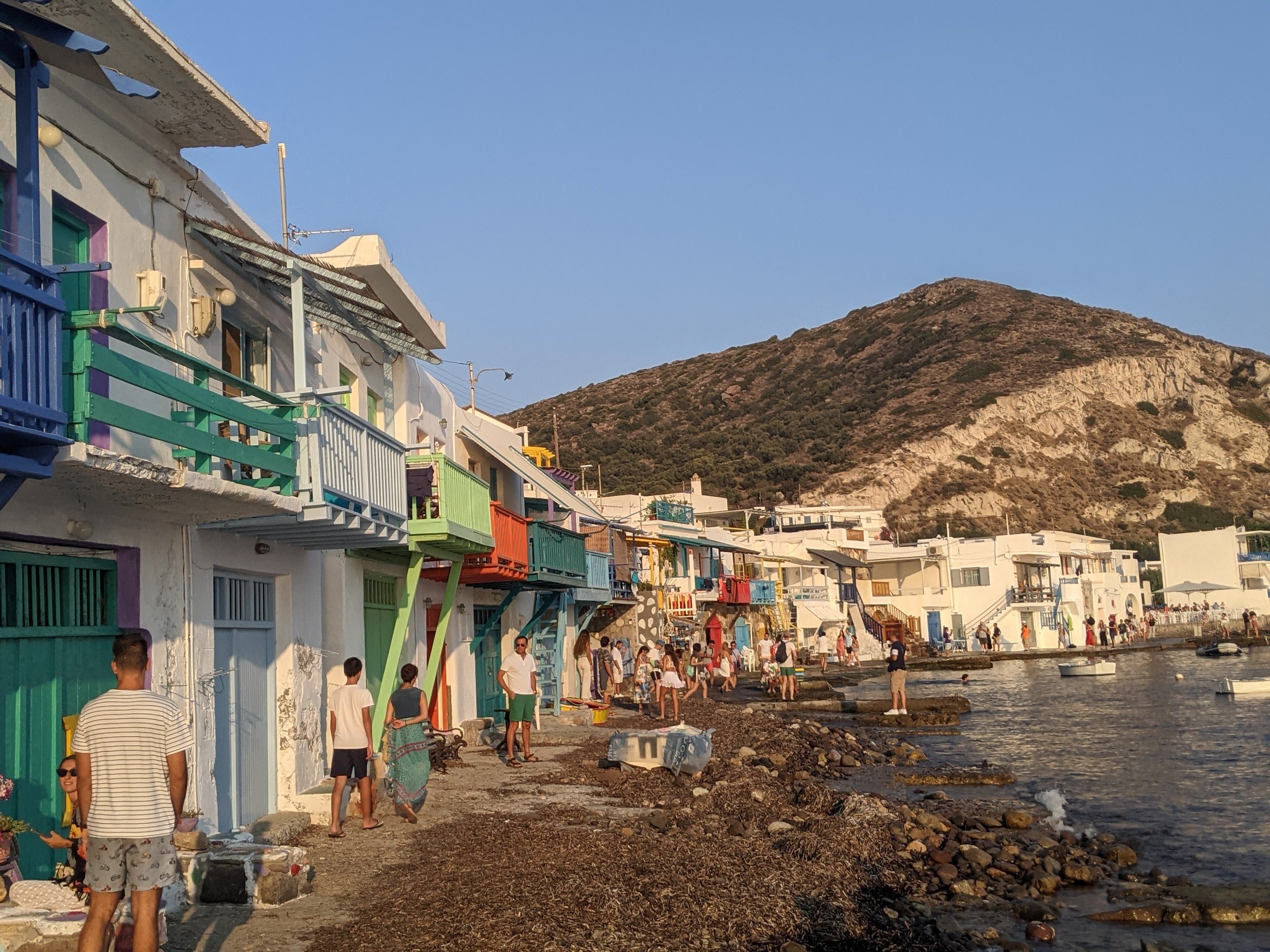 Tout près, il faut faire un tour au petit village de pêcheur de KLIMA : de petites maisons colorés d’un étage bordent ce petit port. L’endroit est charmant, mais comme pour Sarakiniko il faut aimer le flot d’instagrameurs et d’influenceuses prenant la pose. Patience. Si vous avez un peu de chance, ou si vous avez réservé, vous pourrez admirer le coucher de soleil rougeoyant au bar restaurant Astakas. Bon clairement on y va pour le coucher de soleil. La nourriture est bonne mais un peu chère. On regarde le cadre, tel une peinture de Monet et on oublie 🙂