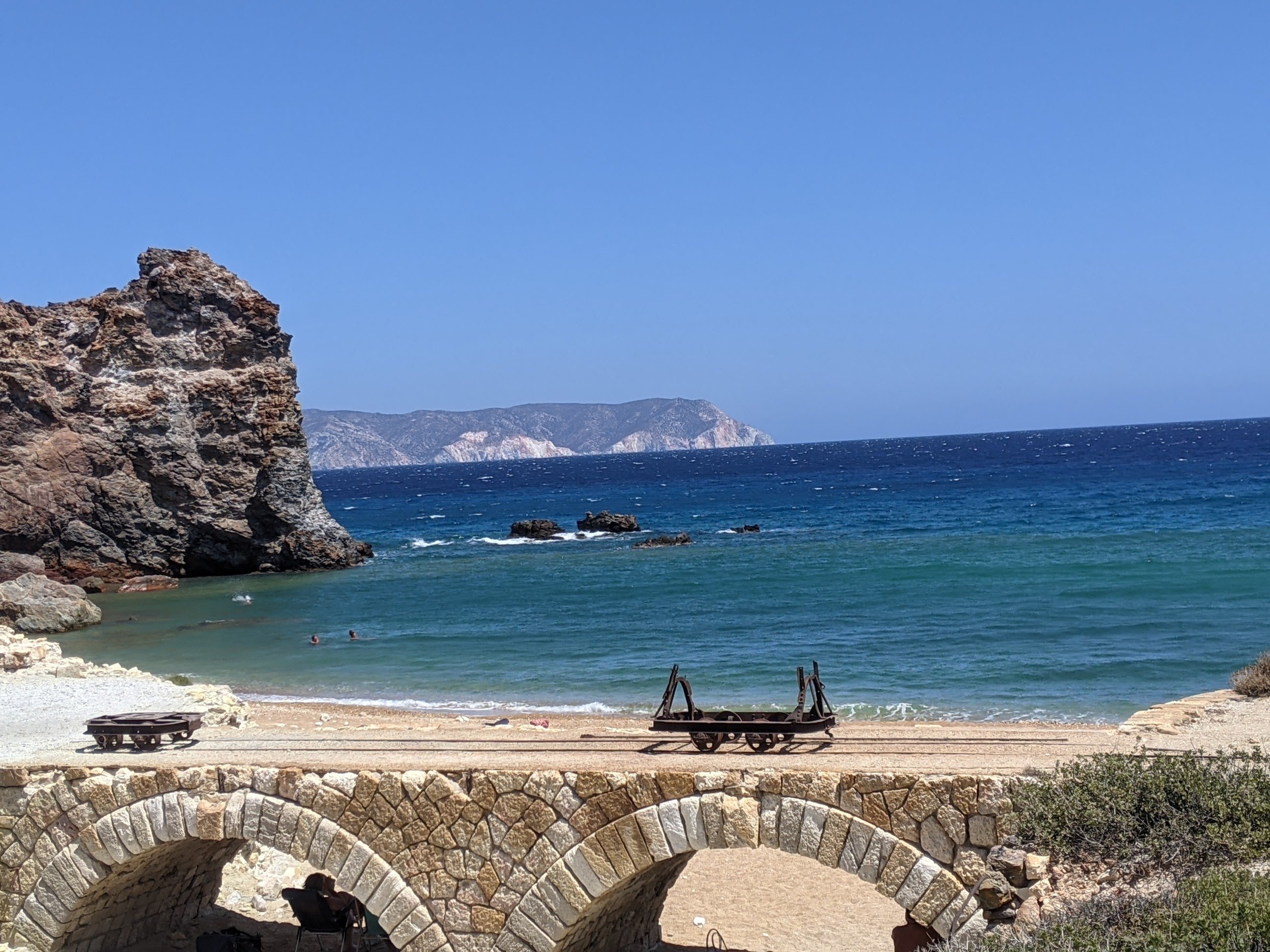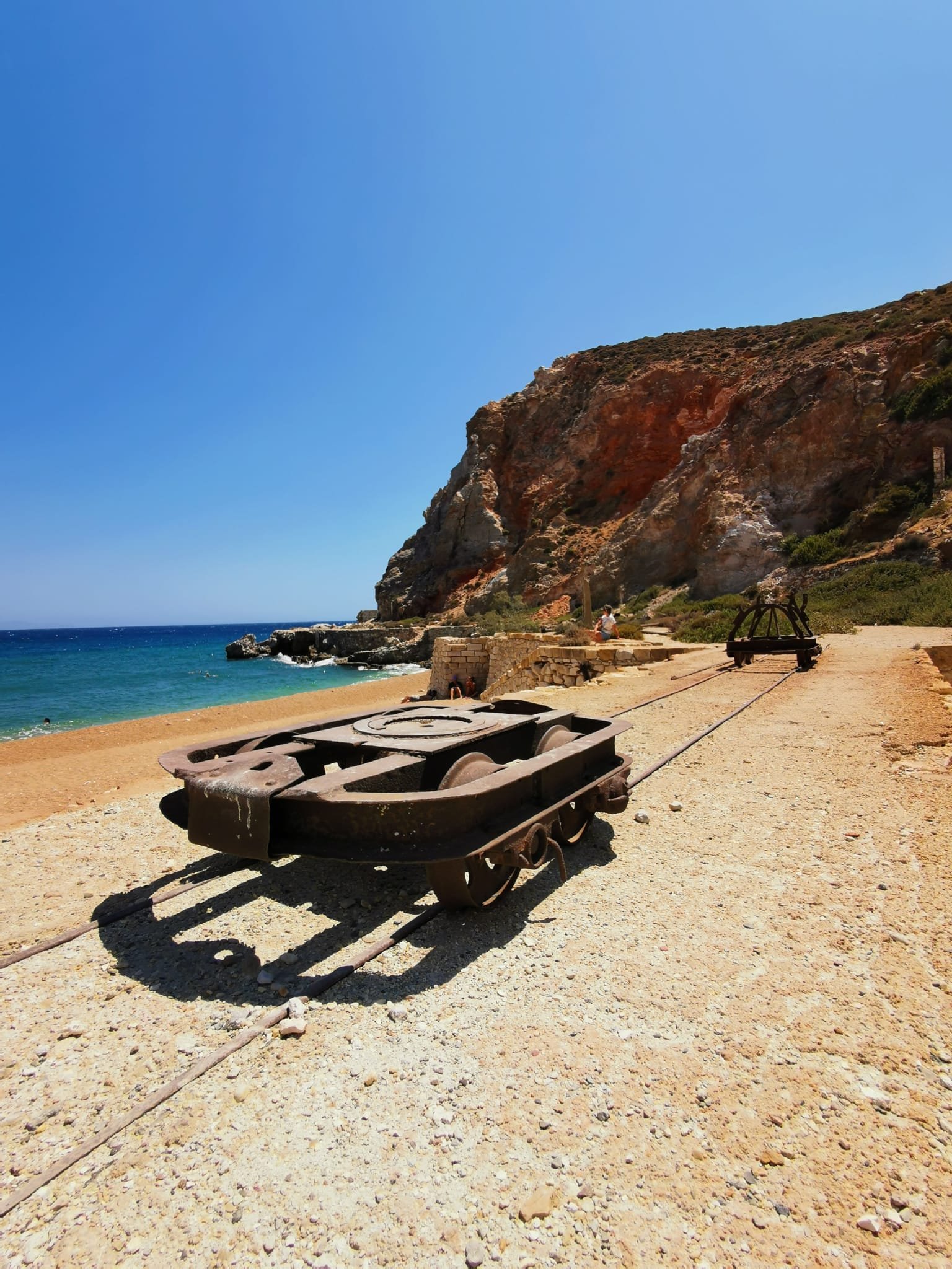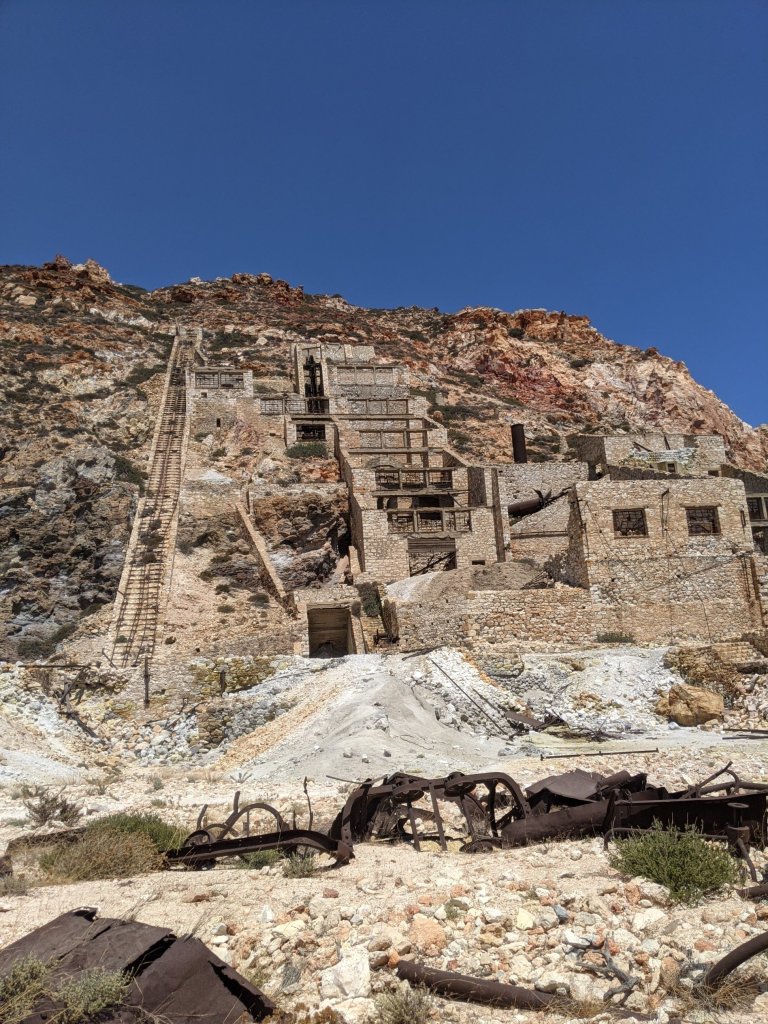 Je vous conseille aussi de vous rendre aux vieilles mines de souffre à l’est de l’île : THIORICHIA. La route se transforme en chemin de terre, ca n’est pas facile d’accès. Sur ce site, se trouvent les vestiges des logements, bureaux, entrepôts témoins du passé industriel de l’île. On se sentirait presque dans le Far West. C’est une sorte d’Urbex grec 🙂 On grimpe, on découvre, on évite les rails, pousse un wagon, on se fait peur en rentrant dans la mine … et on finit par planter un parasol sur la plage déserte. Peu de touriste s’aventurent jusqu’ici. Attention, il n’y a rien à manger ni à boire. Il faut être prévoyants.