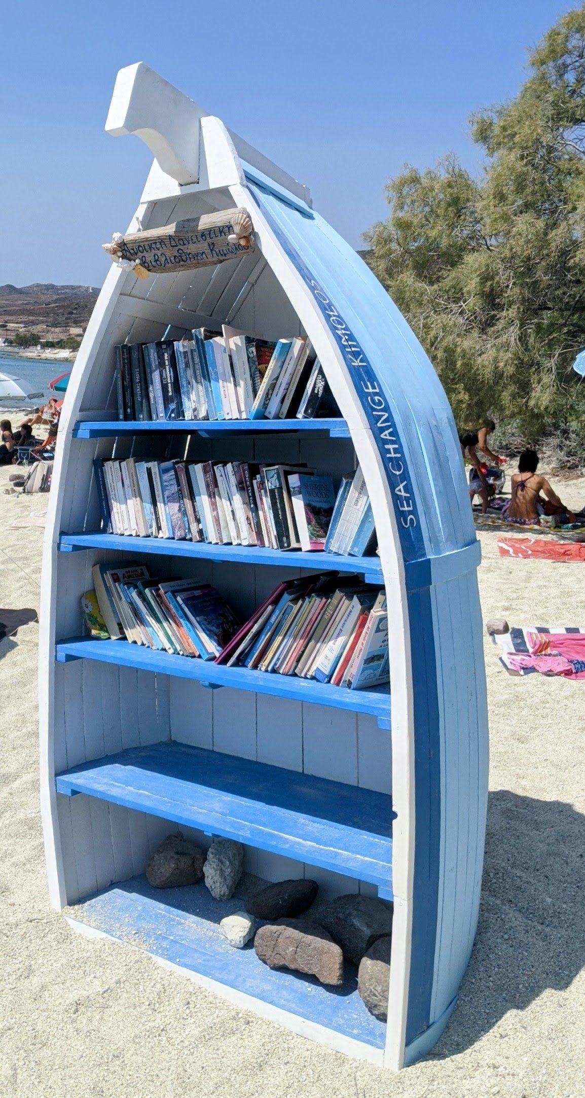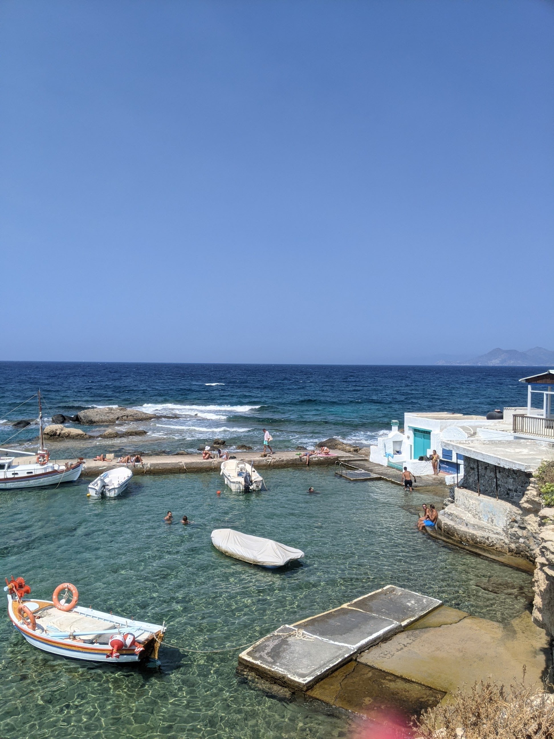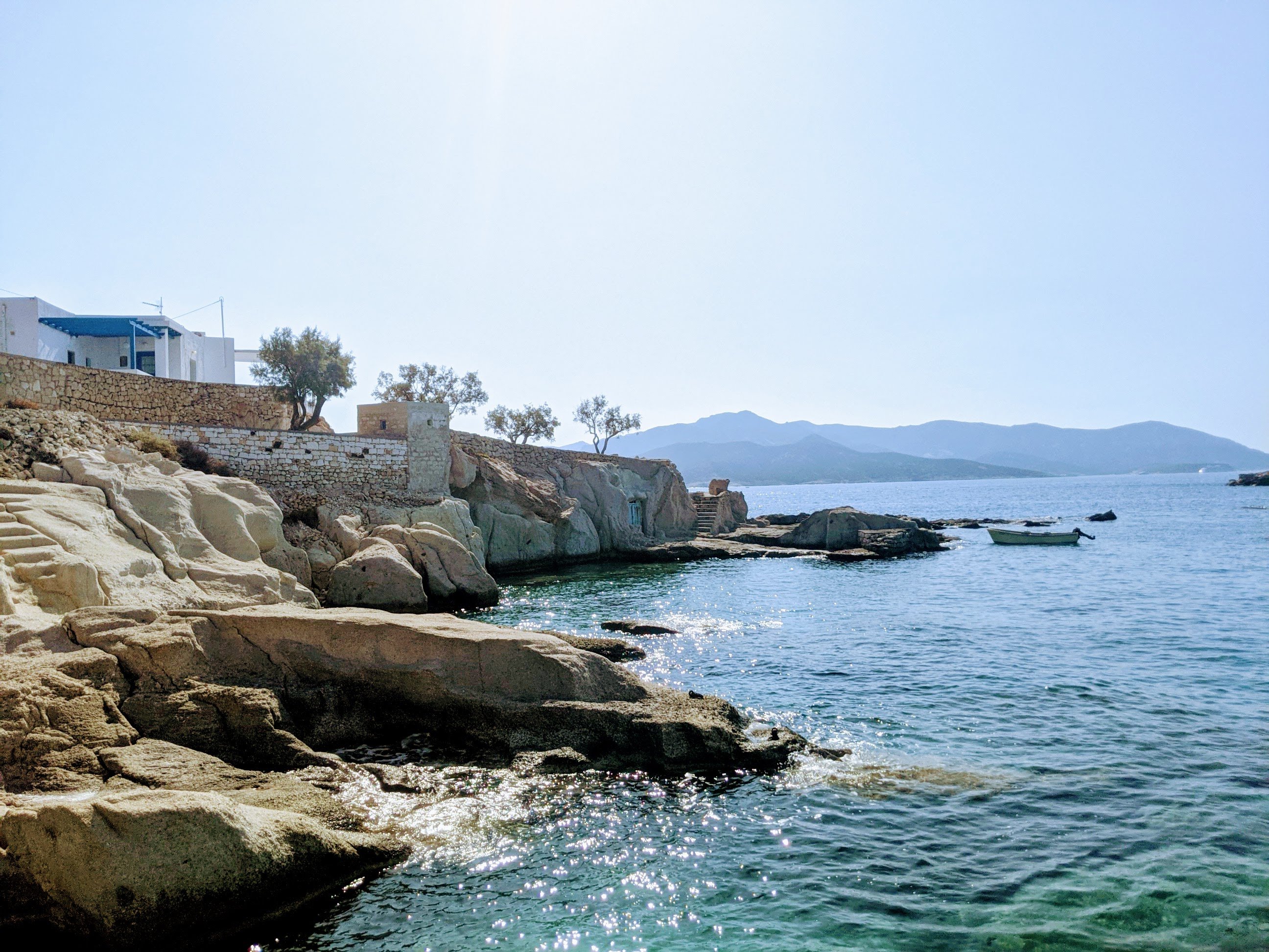 Nous sommes allés également sur l’île de KIMOLOS pour y passer une journée. Le ferry se prend à Pollonia. Nous avons sommes allés nous baigner en arrivant à KARRAS BEACH. Ce sont des rochers qui plongent dans la mer, sur fond de petit garages à bateaux typiques. Puis dans l’après-midi nous nous sommes arrêtés à la plage de PRASSA. Le sable est agréables, la plage est grande mais bondée.