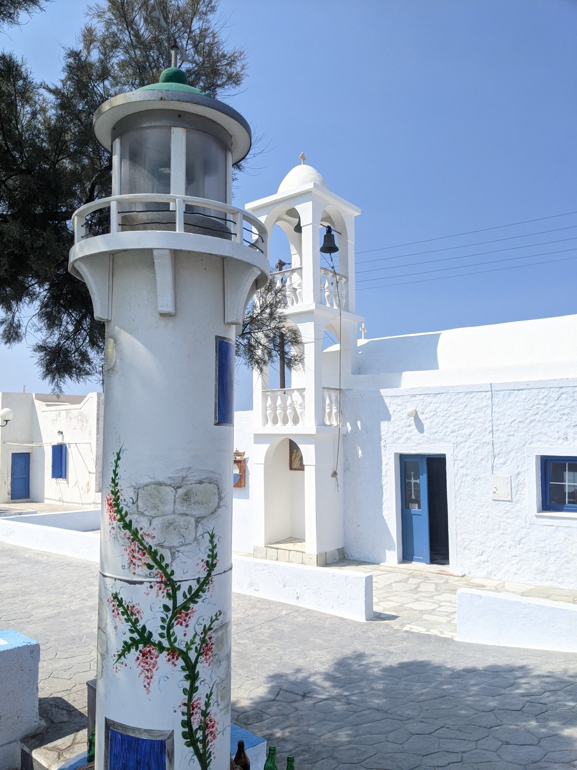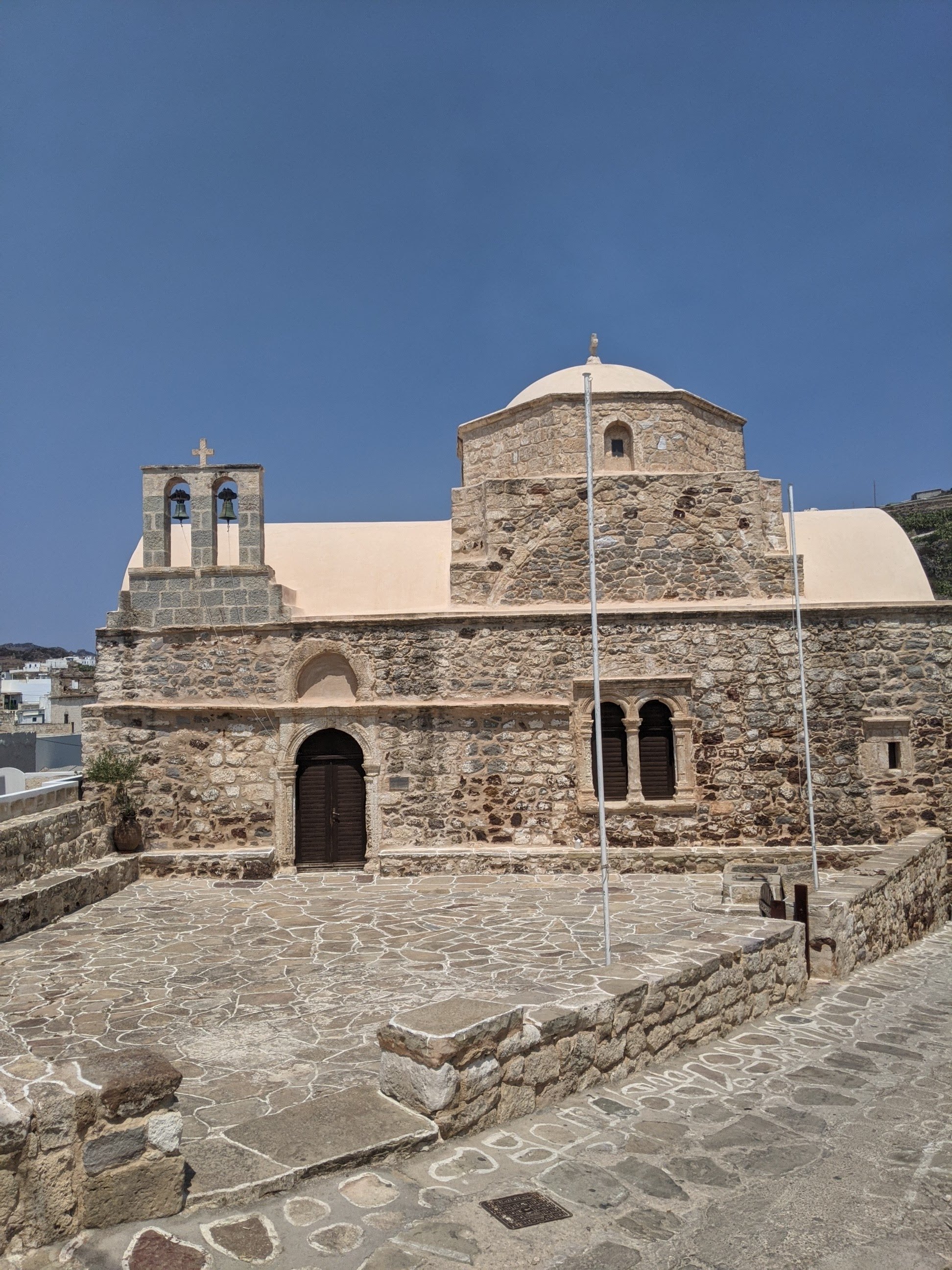 Nous avons déjeuner dans le village de CHORIO, et sommes tombés sous le charme de ses ruelles blanches et bleues, du calme et de l’authenticité qui y règne. Nous sommes loin de l’agitation de Milos. Il faut aller visiter les ruines du Kastro et se perdre dans les rues pour voir de très belles et anciennes églises. Nous avons déjeuner sur la petite terrasse de SINANTISI. J’en garde un délicieux souvenir.
