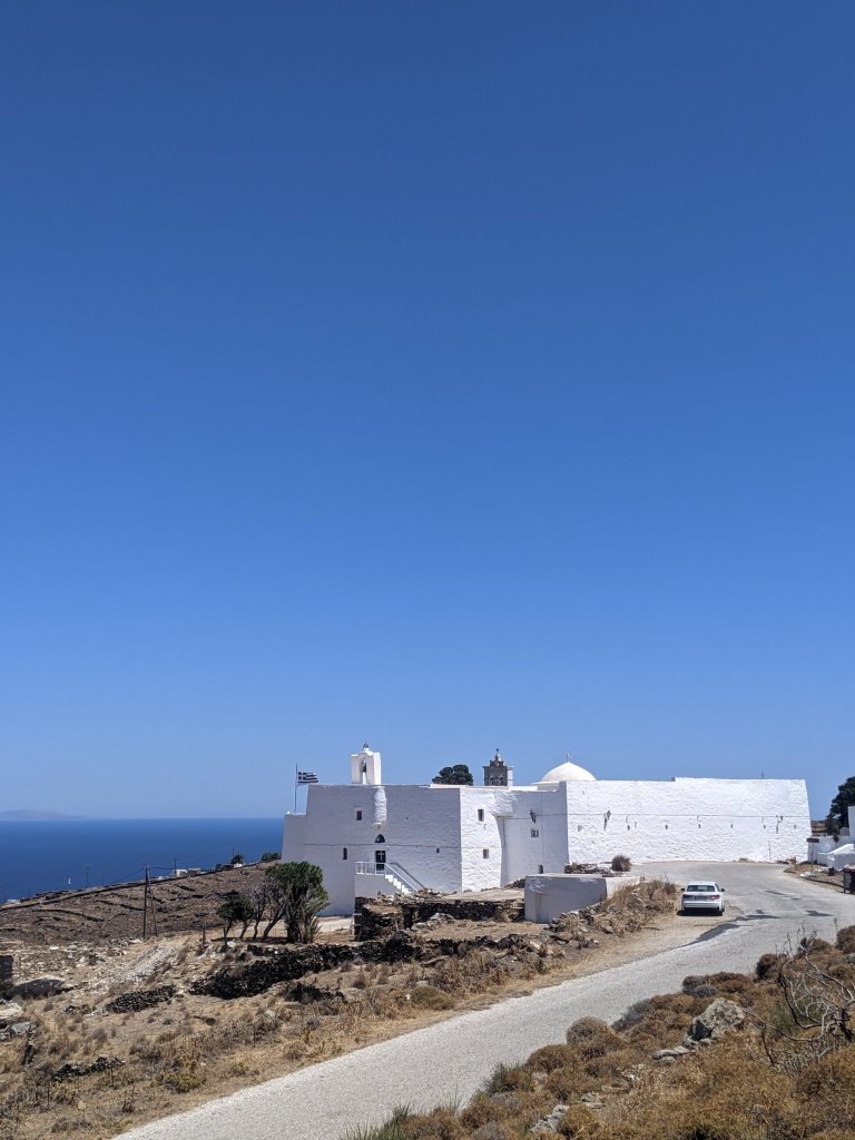 Le lendemain, nous sommes allés randonner. Nous avons profité de la navette Livadi- Chora et avons continué à pieds. Malgré un départ un peu difficile, le début de la rando n’était pas forcément très bien indiqué, ça en valait vraiment le coup. Nous étions seuls sur ces chemins de terre, sur les hauteurs de l’île. Nous avons atteint le monastère des teixerares, puis avons prolongé jusqu’à une petite crique superbe vers le restaurant Nikoulias. Pour atteindre cette plage, il a fallut beaucoup marcher en descente depuis le monastère. Et donc pour le retour…. Monter.