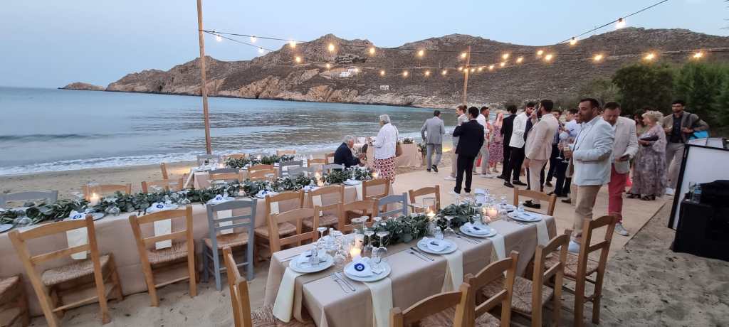 La soirée du lendemain, après la cérémonie a eu lieu à la taverne Stefanakos sur la plage de Psili Ammos. Nous adorons manger là-bas, la nourriture y est excellente, et le service impeccable. Les tables étaient disposées sur la plage, avec des lumières en W en hauteur et des lumières dans les arbres et autres lanternes. La nourriture était en buffet, fabuleuse et très copieuse ! Nous avions un open bar, tenu par Marie-lou, souriante jusqu’au petit matin.