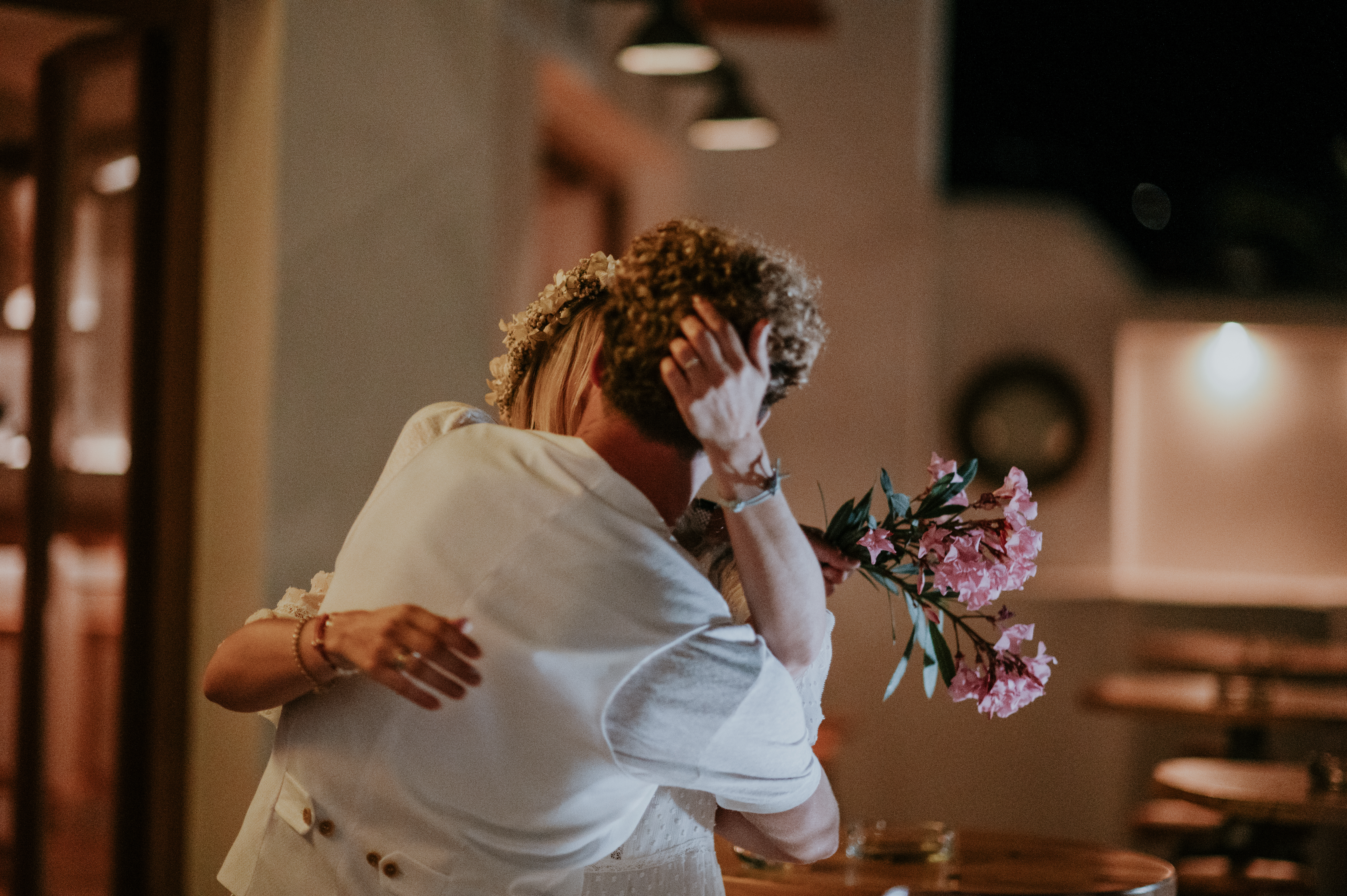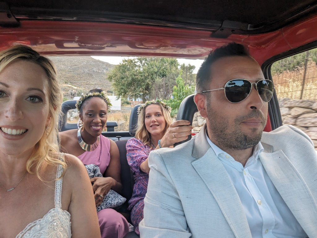 Nous nous sommes préparés chacun de notre coté. Gabriele chez ses parents à Casa Karavi, et moi à notre Hôtel Serifos Blue. La photographe Angel, est passée chez chacun de nous avec le vidéographe Kon et le second photographe Giorgos. La mère de Gabriele, la mienne et mes deux témoins sont venues se faire maquiller à la maison. Puis, l’un de mes meilleurs amis Charles-Hubert est venu me chercher en voiture pour m’amener retrouver mon cher et tendre à la mairie de Chora. Ils ont été adorables pour la gestion du timing, moi étant en panique pour chaque battement d’aile de mouche.