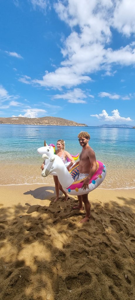 Qu’il est doux de se réveiller sur la plage du Vassilia, même avec peu d’heure de sommeil à son actif. Phryxos et toute son équipe était dans les starting-block pour accueillir nos invités à partir de 11h. Certains furent plus matinaux que d’autres. Les invités prenaient ce qu’ils souhaitaient sur la carte pour le petit dej, brunch ou dej pour certains. Nous sommes restés là toute la journée, avec nos fidèles bouées Pancake et Stella. Baignades et cocktails ont bercés cet après-midi, avant de repartir pour un shooting photo et vidéo sur les hauteurs de Chora. Les images seront merveilleuses à n’en pas douter. (edit : Oh oui !)