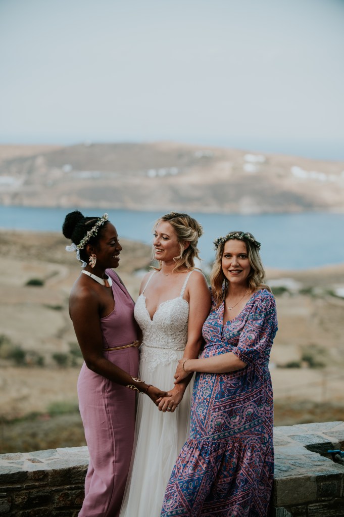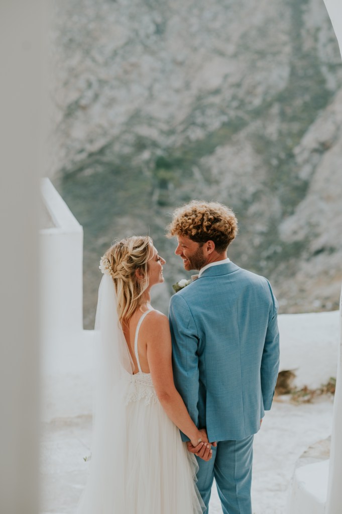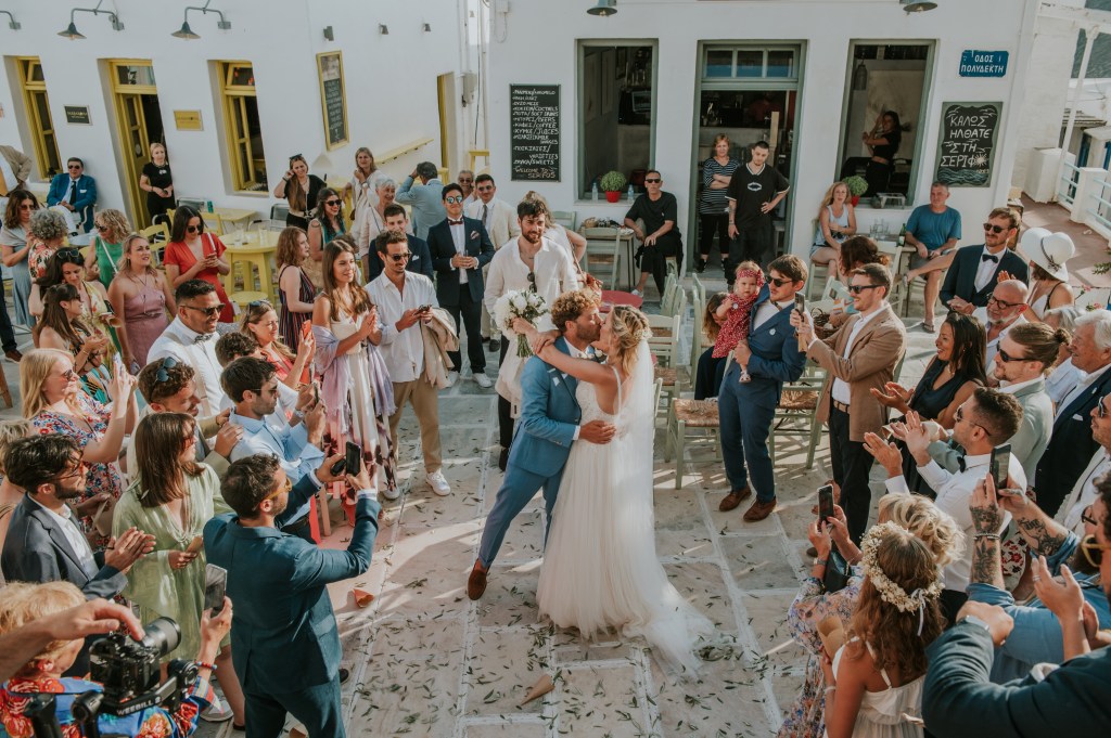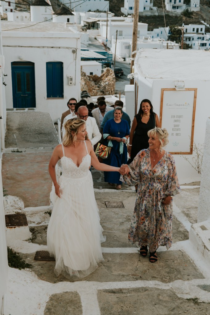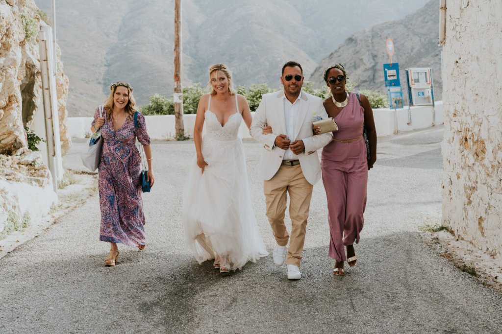 Ma famille et mes amis m’attendaient en bas des escaliers pour faire l’ascension jusqu’à la mairie, tandis que la famille et amis de Gabriele était déjà sur la place. Nous avions prévu des rafraichissements sur place. J’étais impatiente et un peu stressée par tant d’attention sur ma personne ce jour. La cérémonie a eu lieu sur les marches de l’adorable mairie, en anglais et pendant quelques minutes. Simple et efficace ! Les photos quant à elles ont pris un temps fou et notre Angel nationale a montré à tous sa rigueur et parfois sa sévérité ! Gabriele et moi sommes partis faire une séance photo sur les hauteurs de Chora tandis que nos invités partaient pour la taverne de Stefanakos avec la navette que nous avions mis en place.
