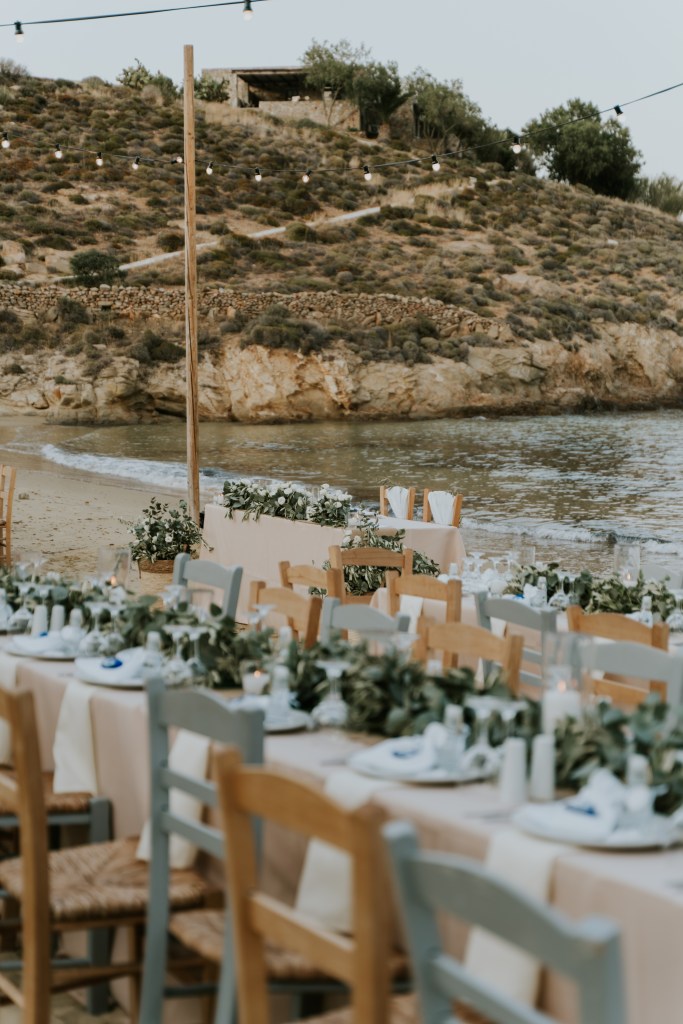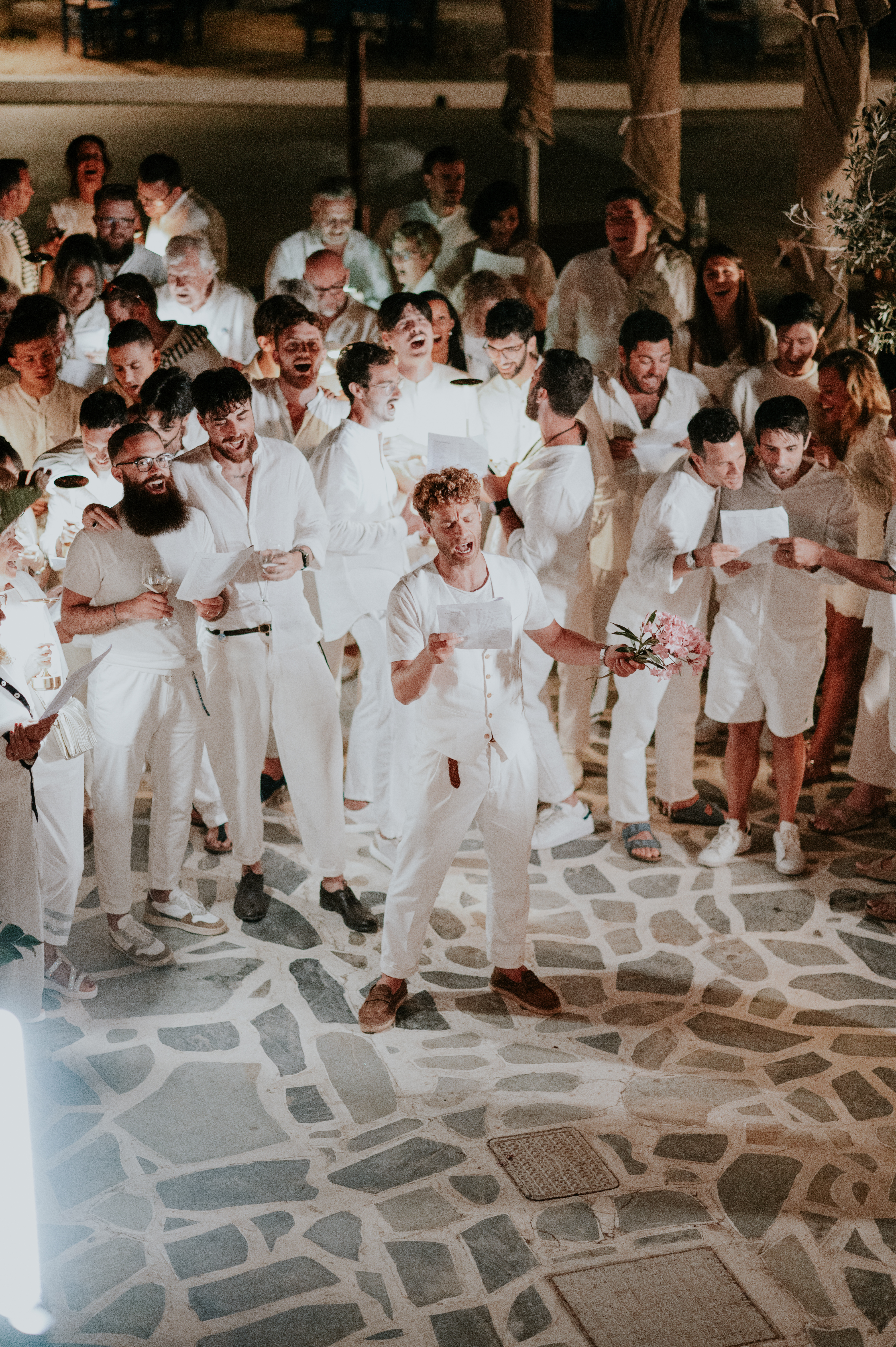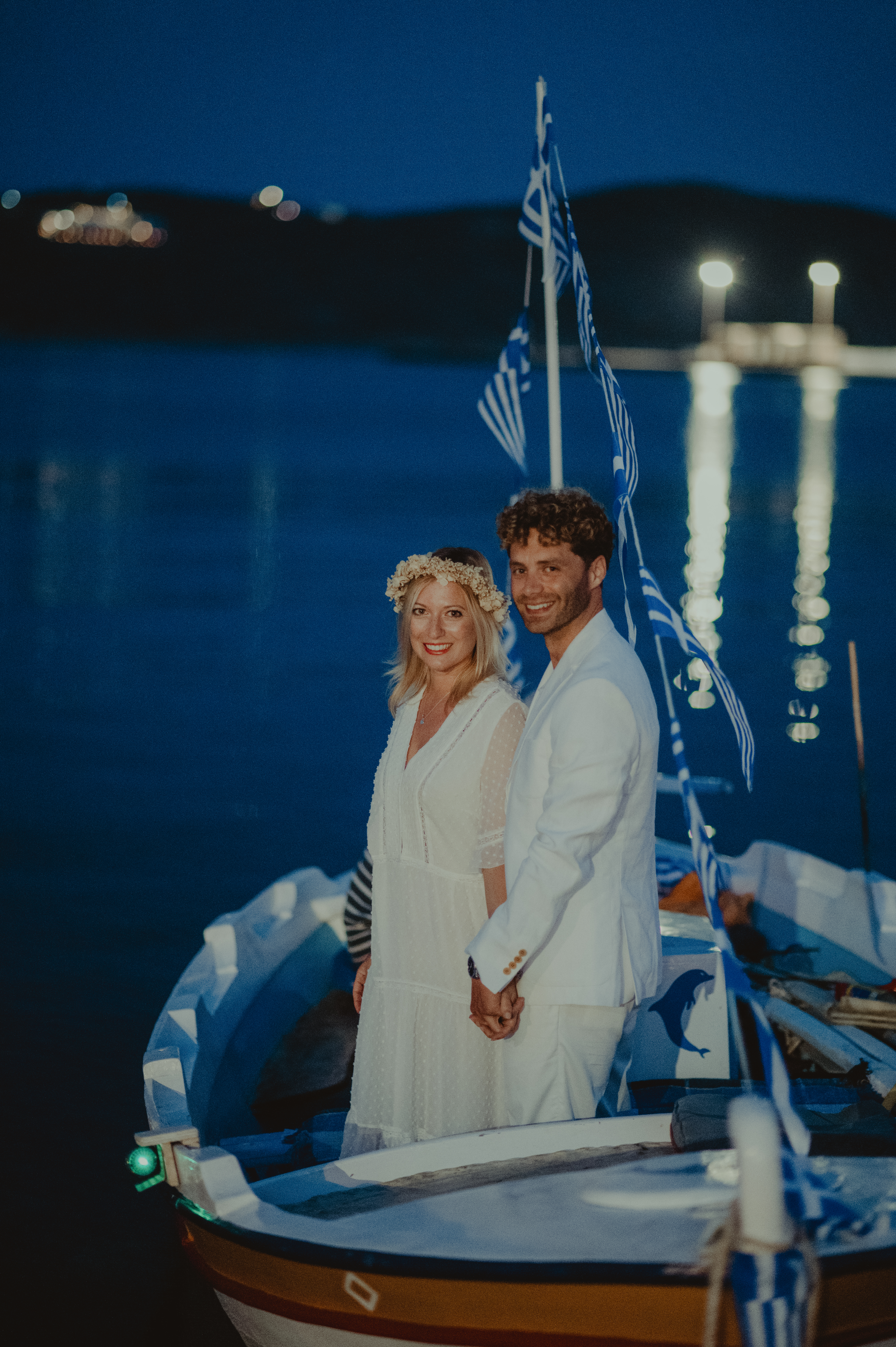 Sur place, nous avons fait une soirée de bienvenue dans l’un des bars sur le port, le ROBINSON. Le dress-code annoncé était : Tous en blanc. Nous sommes arrivées après un shooting photo sur la plage d’Agios Sostis, sur un petit bateau conduit par Mister Giorgios, entre deux feux de Bengale et corne de brume. Le port parle encore de nous à l’heure actuelle et les gens me contactent même sur instagram ! Nos invités ne s’y attendaient pas, ils ont été surpris et enchantés. De plus, le ton du mariage était donné. La soirée a battu son plein, mon futur mari se pliant à la tradition italienne de la serennata : lui, accompagné de la famille et amis m’ont chanté de belles chansons italiennes et françaises. Une soirée merveilleuse et qui a largement contribué au succès de la soirée de mariage : les gens avaient déjà fait connaissance et des liens étaient déjà tissés.